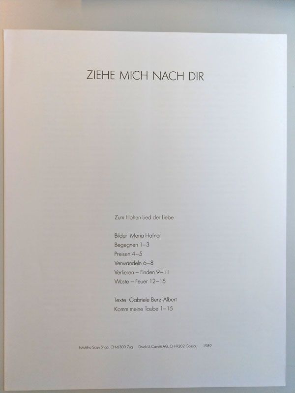 Maria Hafners schrieb dazu einen einleitenden Text. Ergänzt wurde die Kunstdruckmappe mit fünfzehn Gedichten von Gabriele Berz-Albert «Komm meine Taube».